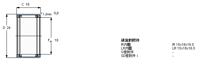 型號:HK 1816.2RS 品牌:SKF 系列:沖壓外圈滾針軸承 內徑:18 mm 外徑:24 mm 寬度:16 mm