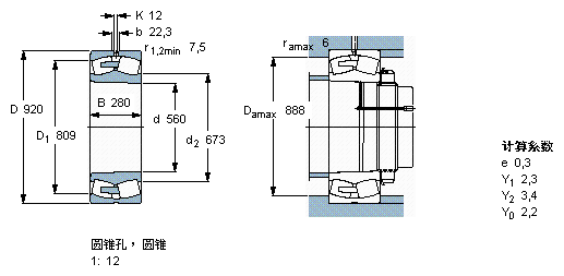 型號:231/560 CAK/W33 * 品牌:SKF 系列:球面滾子軸承,圓柱和圓錐孔 內徑:560 mm 外徑:920 mm 寬度:280 mm