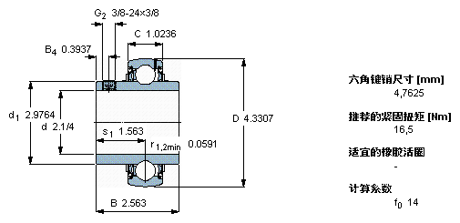 型號:YAR 212-204-2F 品牌:SKF 系列:帶沉頭螺釘的 Y 型軸承 內徑:57.15 mm 外徑:110 mm 寬度:65.1 mm