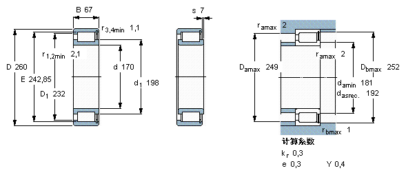 型號:NCF 3034 CV 品牌:SKF 系列:單列滿裝圓柱滾子軸承 內徑:170 mm 外徑:260 mm 寬度:67 mm