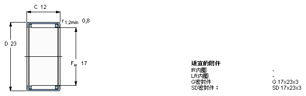 型號:HK 1712 品牌:SKF 系列:沖壓外圈滾針軸承 內徑:17 mm 外徑:23 mm 寬度:12 mm