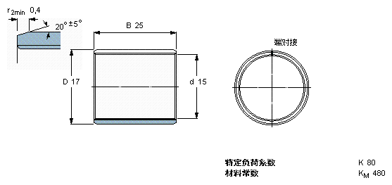 型號:PCM 151725 B 品牌:SKF 系列:公制尺寸的復合干式滑動套筒 內徑:15 mm 外徑:17 mm 寬度:25 mm