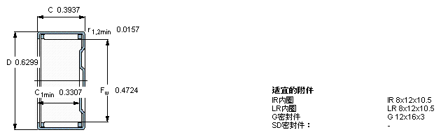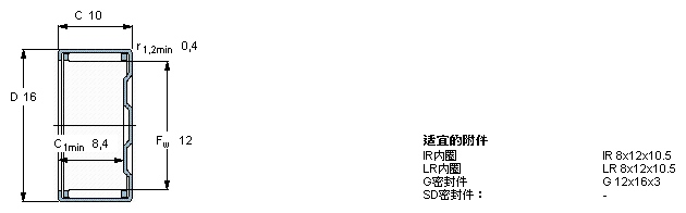 型號:BK 1210 品牌:SKF 系列:沖壓外圈滾針軸承 內徑:12 mm 外徑:16 mm 寬度:10 mm